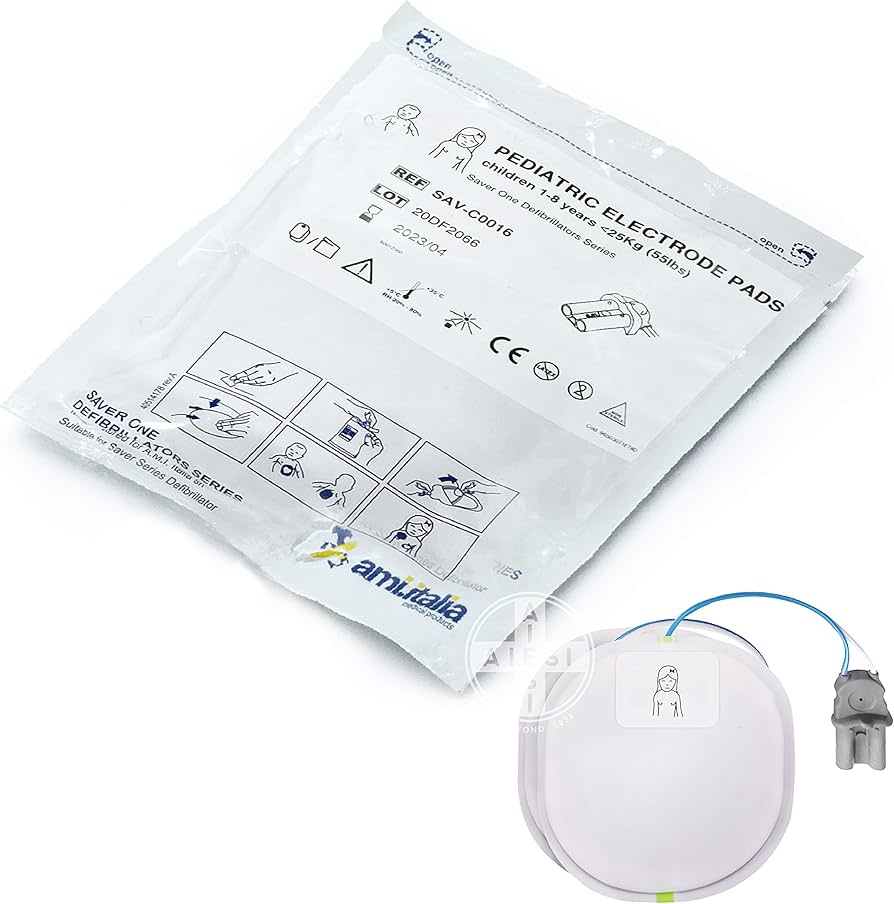 Les électrodes pédiatriques originales A.M.I. Italia (SAV-C0016) sont spécialement conçues pour les patients pédiatriques et compatibles avec tous les modèles de DEA Saver One (Saver One, Saver One D et Saver One P).